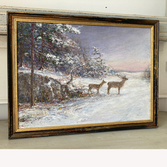 Deer in a Winter Landscape at Dusk - Vintage Scandinavian Winter Scene with Snow - Framed Original Vintage Art