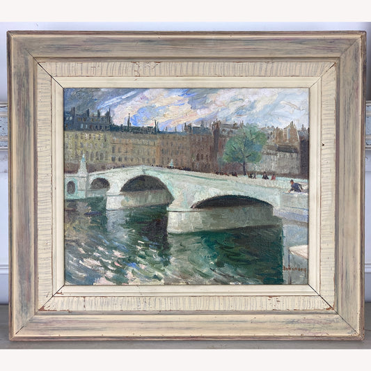 Paris ~ An Original Vintage Painting of Paris Circa 1950 - Framed Oil on Canvas of Figures Walking across the River Seine