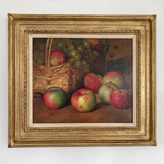 Apples Still Life - A French Original Antique Still Life Oil Painting of Apples and Grapes in a Basket - Framed Original Kitchen Art
