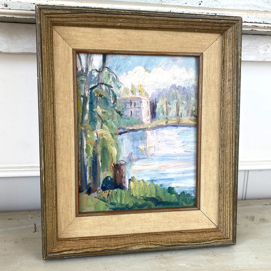 Vintage Small Landscape Framed European Oil Painting - Lakeside View